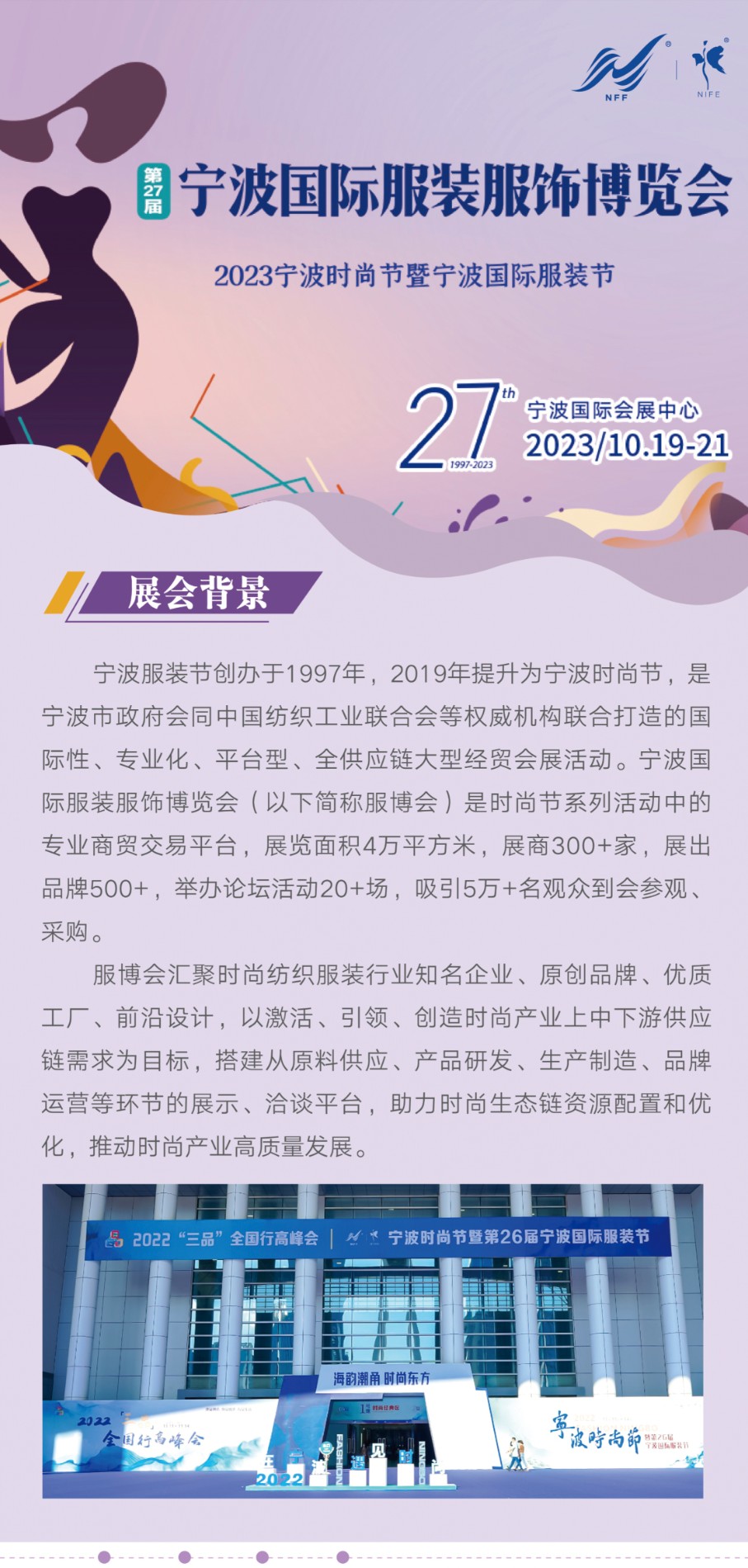 宁波服装节创办于1997年,2019年提升为宁波时尚节,是宁波市政府会同中国纺织工业联合会等权威机构联合打造的国际性、专业化、平台型、全供应链大型经贸会展活动。宁波国际服装服饰博览会(以下简称服博会)是时尚节系列活动中的专业商贸交易平台,展览面积4万平方米,展商300+家,展出品牌500+,举办论坛活动20+场,吸引5万+名观众到会参观、采购。