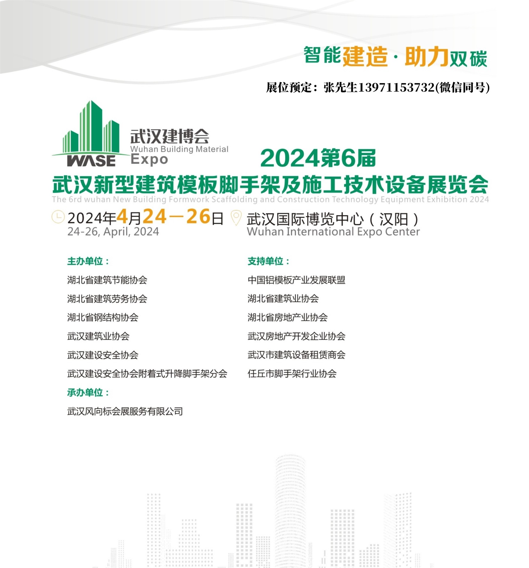 武汉模板脚手架展与同期建博会形成呼应,不仅拥有每届省市建筑业协会组团“建工单位集结号”资源,而且成为武汉建设安全协会、湖北省建筑劳务协会推荐施工技术产品窗口。