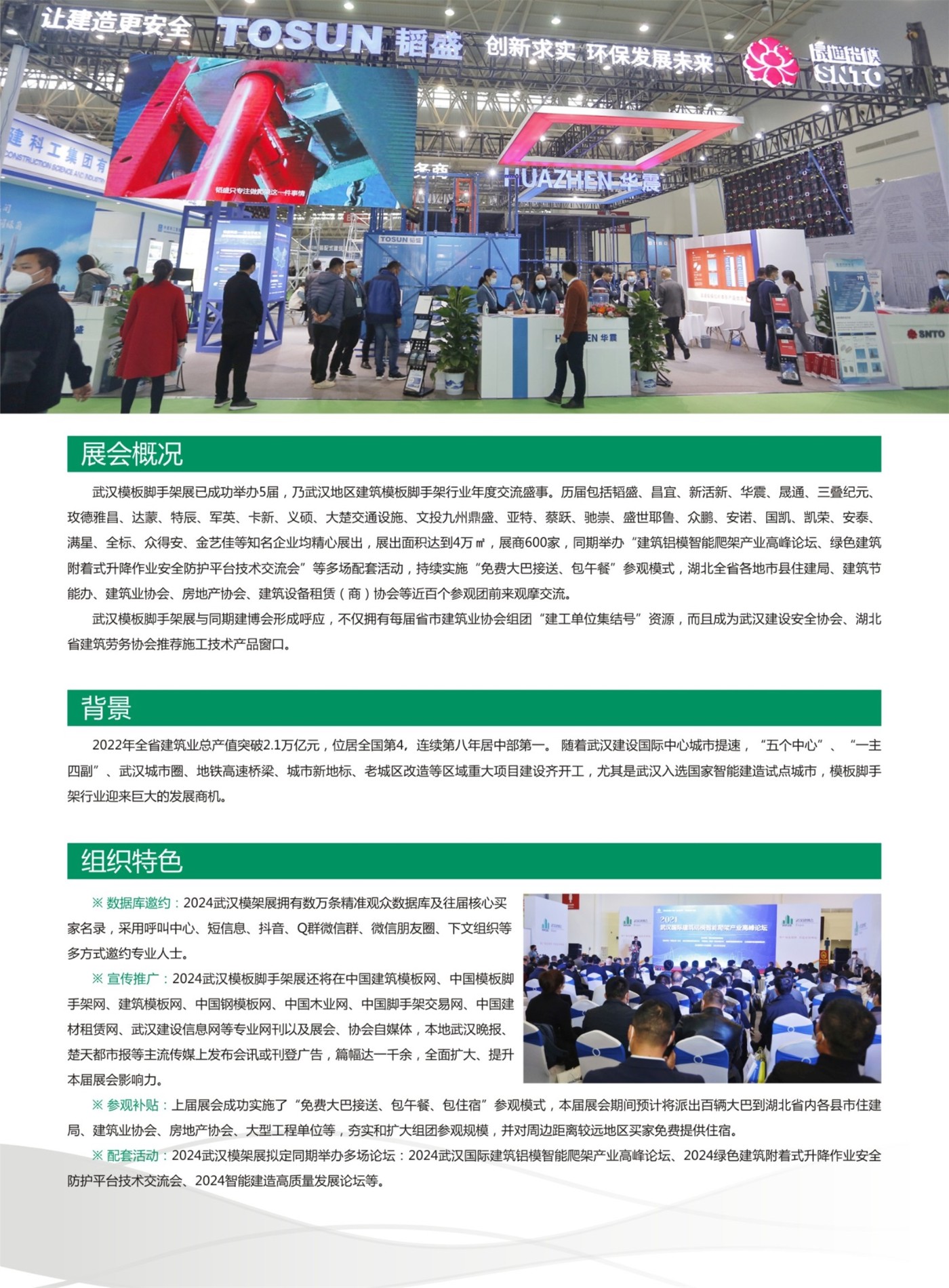 武汉模板脚手架展已成功举办5届,乃武汉地区建筑模板脚手架行业年度交流盛事。历届包括韬盛、昌宜、新活新、华震、晟通、三叠纪元、玫德雅昌、达蒙、特辰、军英、卡新、义硕、大楚交通设施、文投九州鼎盛、亚特、蔡跃、驰崇、盛世耶鲁、众鹏、安诺、国凯、凯荣、安泰、满星、全标、众得安、金艺佳等知名企业均精心展出,展出面积达到4万㎡,展商600家,同期举办“建筑铝模智能爬架产业高峰论坛、绿色建筑附着式升降作业安全防护平台技术交流会”等多场配套活动,持续实施“免费大巴接送、包午餐”参观模式,湖北全省各地市县住建局、建筑节能办、建筑业协会、房地产协会、建筑设备租赁(商)协会等近百个参观团前来观摩交流。
