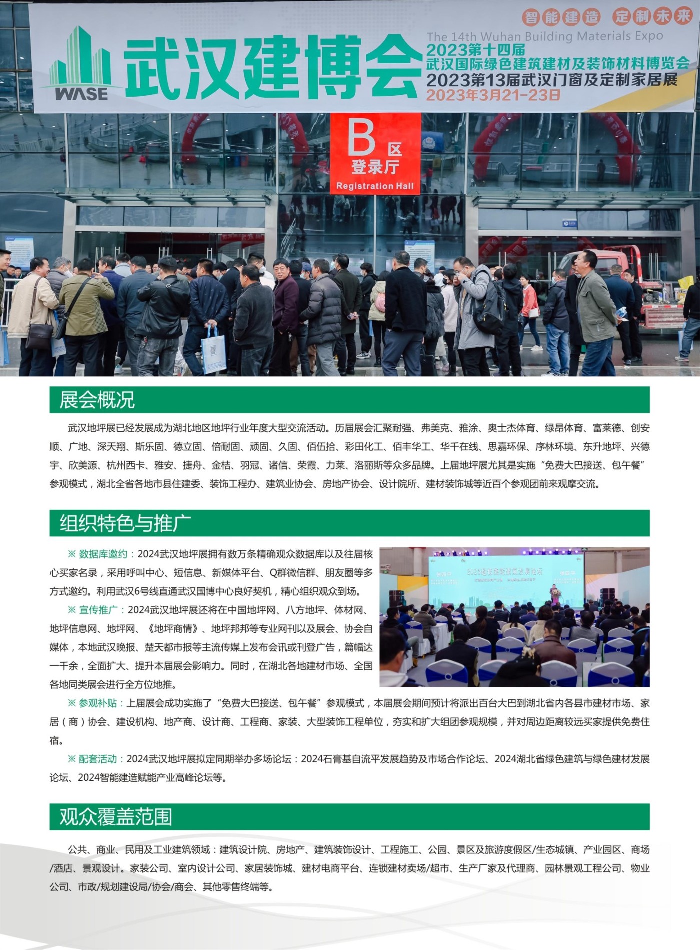 配套活动。2024武汉地坪展拟定同期举办多场论坛:2024石膏基自流平发展趋势及市场合作论坛、2024湖北省绿色建筑与绿色建材发展论坛、2024智能建造赋能产业高峰论坛等。