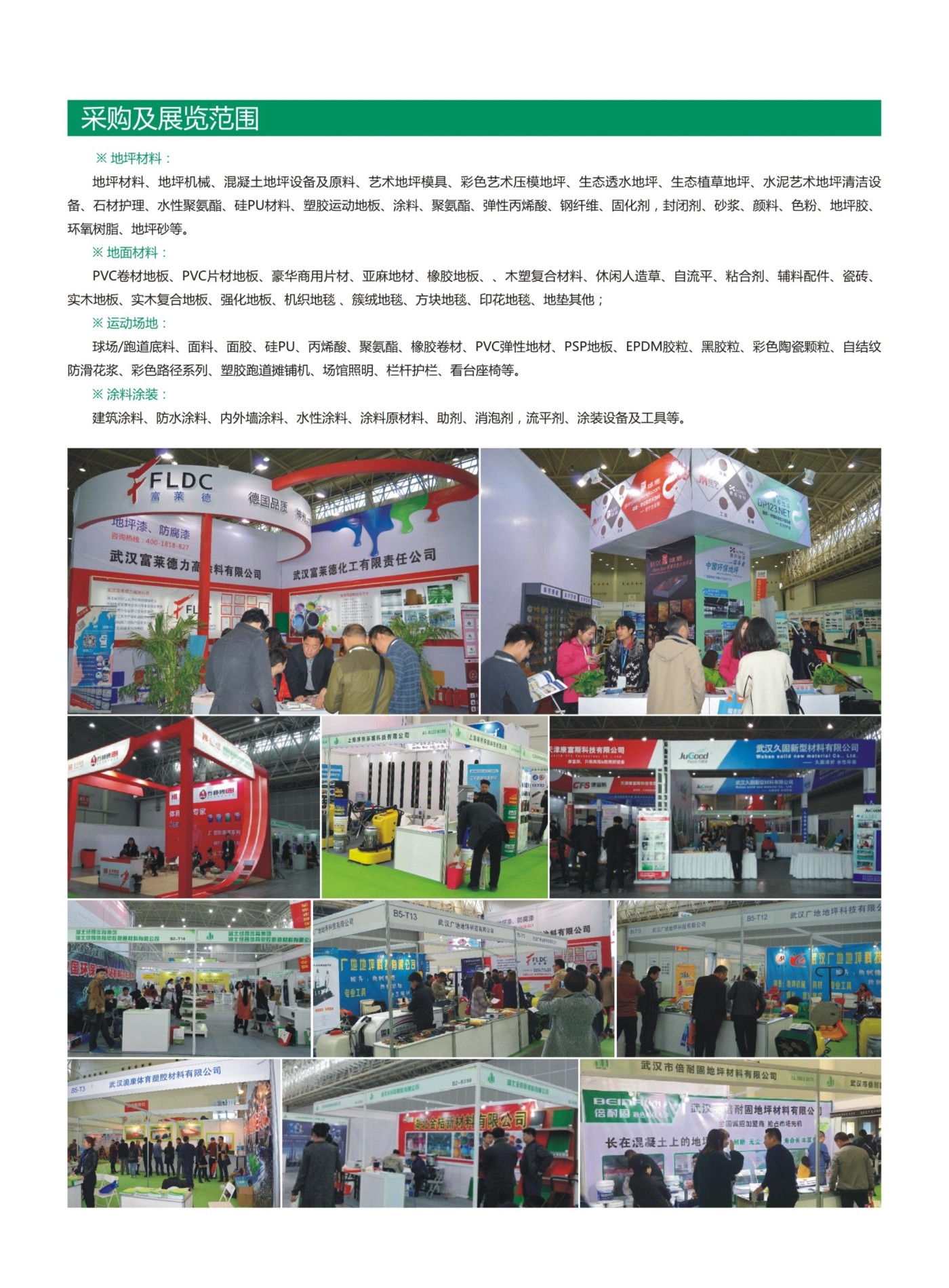 武汉地坪展已经发展成为湖北地区地坪行业年度大型交流活动。历届展会汇聚耐强、弗美克、雅涂、奥士杰体育、绿昂体育、富莱德、创安顺、广地、深天翔、斯乐固、德立固、倍耐固、顽固、久固、佰伍拾、彩田化工、佰丰华工、华千在线、思嘉环保、序林环境、东升地坪、兴德宇、欣美源、杭州西卡、雅安、捷舟、金桔、羽冠、诸信、荣霞、力莱、洛丽斯等众多品牌。上届地坪展尤其是实施“免费大巴接送、包午餐”参观模式,湖北全省各地市县住建委、装饰工程办、建筑业协会、房地产协会、设计院所、建材装饰城等近百个参观团前来观摩交流。