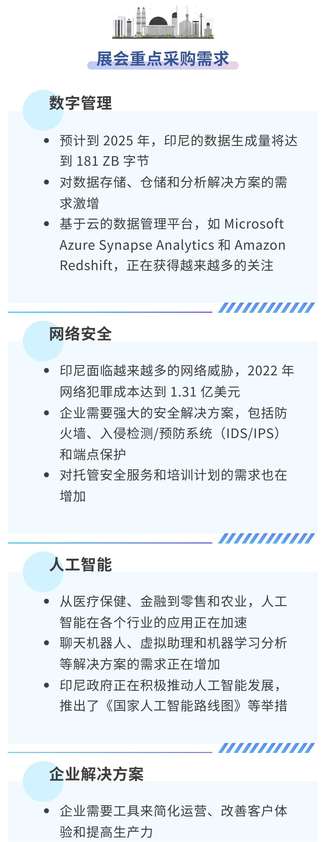 2024年印度尼西亚数字化转型博览会Digital Transformation Indonesia是一个将技术解决方案提供商与政府机构、企业相互连接,推动中国和印度尼西亚数字化转型的良好平台。融合了线上信息咨讯传播与线下展览会议供应商与使用方之间的沟通合作,旨在促进中国和印尼两国数字化转型之旅的各个机构和利益相关者之间的联系并传播有关数字化转型的理念、技术、产品与行业互动,促进数字化转型过程中参与者之间的交流与合作。印尼目前只有43%的企业正在实施或扩大数字化转型,与此同时,34%的企业正在进行数字化转型之旅,市场空间巨大。 2024年展会规模超10000平方,拥有来自全球及亚太地区的300多家展商,将邀约超20000名采购商到场。配套活动内容由展览、高级别会议、研讨会、商业配对计划和评选组成,是印度尼西亚数字化转型的强大支持系统。